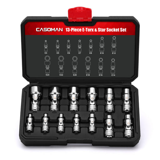 Original price $39.97 - Original price $39.97Original price$39.97$39.97 - $39.97Current price $39.97CASOMAN 13PCS 1/4" & 3/8" Drive Universal External Star Socket Set, E4 to E24, CR-V, Swivel Head, 360 Degree Access, with Sturdy Molded Case